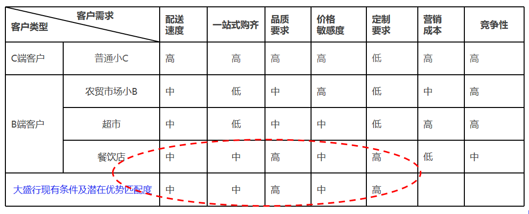 大盛行的核心優(yōu)勢來自科朗的“芯片級”育種優(yōu)勢,能根據(jù)不同菜肴,從源頭品種上滿足對肉禽地道品種的要求,滿足客戶對肉禽菜肴正宗口味的要求。但在配送速度和品類齊全度方面,略顯不足。相比之下,餐飲類客戶對品質(zhì)和品類及配送速度的需求,與大盛行現(xiàn)有條件剛好匹配,能實現(xiàn)大盛行的戰(zhàn)略機(jī)會最大化。