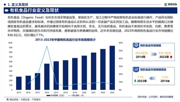 近年來,中國有機(jī)食品市場呈現(xiàn)快速增長趨勢。根據(jù)智研咨詢數(shù)據(jù)顯示,2023年中國有機(jī)食品市場規(guī)模達(dá)到936.3億元,同比增長7.7%。這一增長主要得益于消費(fèi)者對(duì)健康、綠色食品的需求提升,以及政策對(duì)有機(jī)食品產(chǎn)業(yè)的支持。然而,有機(jī)食品市場競爭激烈,品牌需要在產(chǎn)品品質(zhì)、渠道布局和營銷策略上具備顯著優(yōu)勢,才能脫穎而出。
